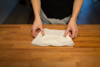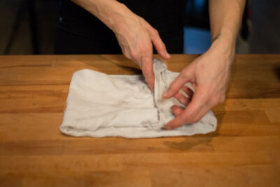 Das 1. Baum­woll­tuch dar­in trän­ken und aus­wrin­gen. Da­nach das Tuch auf die be­trof­fe­ne Stel­le le­gen. Wenn mög­lich, kann es um die Glied­ma­ße ge­wi­ckelt wer­den; bei Schul­ter, Hüf­te oder Rü­cken legt man es nur auf.